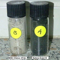 • Fouling occurs when, normally, the volatile constituents in the ash condense on fly ash particles, convection tubes, and existing ash deposits at temperatures which keep the volatile constituent liquid and allow them to react chemically to form hard bonded deposits. Slagging also takes place when the molten ash particles strike a wall or tube surface and cool down to solidify. CHINCO Catalyst however increases the fusion temperature of ash and allows complete combustion of the ash and tar like particles in the coal before they can do the harm in their liquid state. The ash is now dry and friable, and easy to wash off the tubes where soft dry build-up occurs.