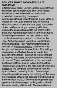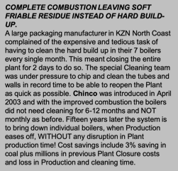• Black sooty smoke and particulate emissions will also be virtually eliminated with the use of the CHINCO Catalyst due to the lower ignition temperature combusting the flammable soot and other particulates in the boiler gasses.