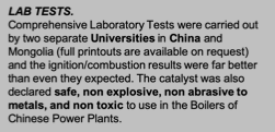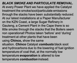 There are other suppliers of coal additives, but our catalyst is unique and the only product that not only keeps the boiler clean, but also reduces sulphur emissions (Cause of industrial acid rain). The results of recent tests carried out independently by various clients, showing a halving of poisonous gasses, is attached below.