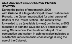 • SOx and NOx can be reduced drastically by using the harmless and non toxic natural CHINCO Coal Catalyst. Conclusive independent test carried out at Rooiwal Power Station and several other Companies, including some in China. The percentage drop in using the catalyst was amazing. This is achieved through improved combustion by reducing the ignition temperature of the coal plus its hydro carbon contents such as soot char and even sulphur. Combustion thus starts earlier and is more complete. See these results in the independent test at Rooiwal Power Station. (LINK) Another reason for the reduction of SO2 is the Mn02 in the CHINCO mix reduces SO2 to a harmless sulfate that is then removed through the ash. (MnO2+ SO2→ MnSO4 )