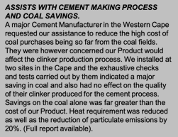 There are other suppliers of coal additives, but our catalyst is unique and the only product that not only keeps the boiler clean, but also reduces sulphur emissions (Cause of industrial acid rain). The results of recent tests carried out independently by various clients, showing a halving of poisonous gasses, is attached below.